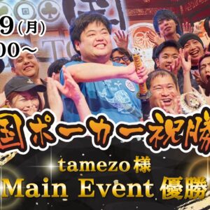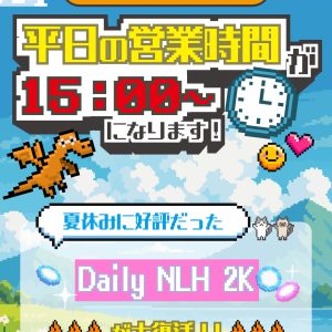 開始時刻    :12時00分 参加費     :チケットエントリー3,000円         :ダイレクトエントリー15,000円         :リエントリー10,000円 ※マルチチケットを1万円分として使用可能です。 スタートスタック  : $50,000 レイトレジスト   : 16時50分   カジノクエスト   カジノクエスト ♠️    -1st- 300,000コイン   ♠️    -2nd- 200,000コイン   ♠️    -3rd- 100,000コイン   ♠️     -4th-5th- 50,000コイン   ♠️     -6th-7th- 20,000コイン   ♠️     -8th-9th-[...]