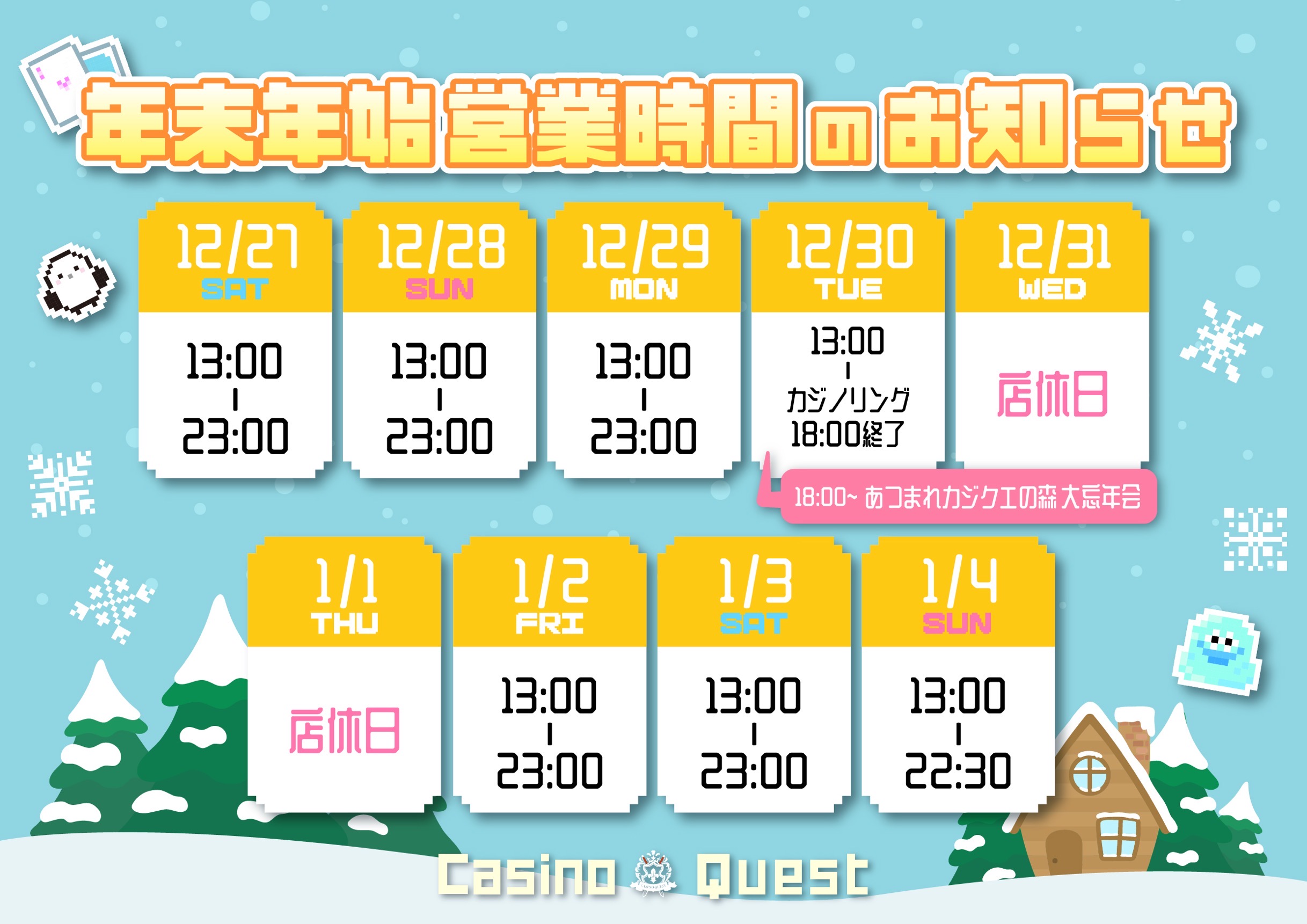ホーム > お知らせ一覧 > お知らせ > 年末年始営業スケジュールのお知らせ 年末年始営業スケジュールのお知らせ 2025.12.20 今年もカジノクエストをご愛顧頂きありがとうございました!上記が年末年始の営業スケジュールになります🎶30日(火)に大忘年会を行った後、2日(金)からはウマ娘コスデーでお送りいたします🐎💕2026年もよろしくお願いいたします!! 0 0 votes Article Rating Miles Walked: 10-19 Temper Level: Low Favorite Fruits: orange, grape « 新しい投稿へ 古い投稿へ » Subscribe Login 更新通知を受け取る » 新しいコメント コメントの新しい返信 Label {} [+] Name* Email* Website Δ Label {} [+] Name* Email* Website Δ 0 コメント Oldest Newest Most Voted Inline Feedbacks View all comments
